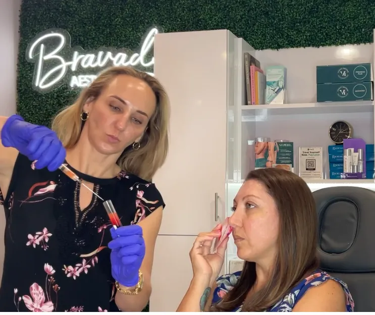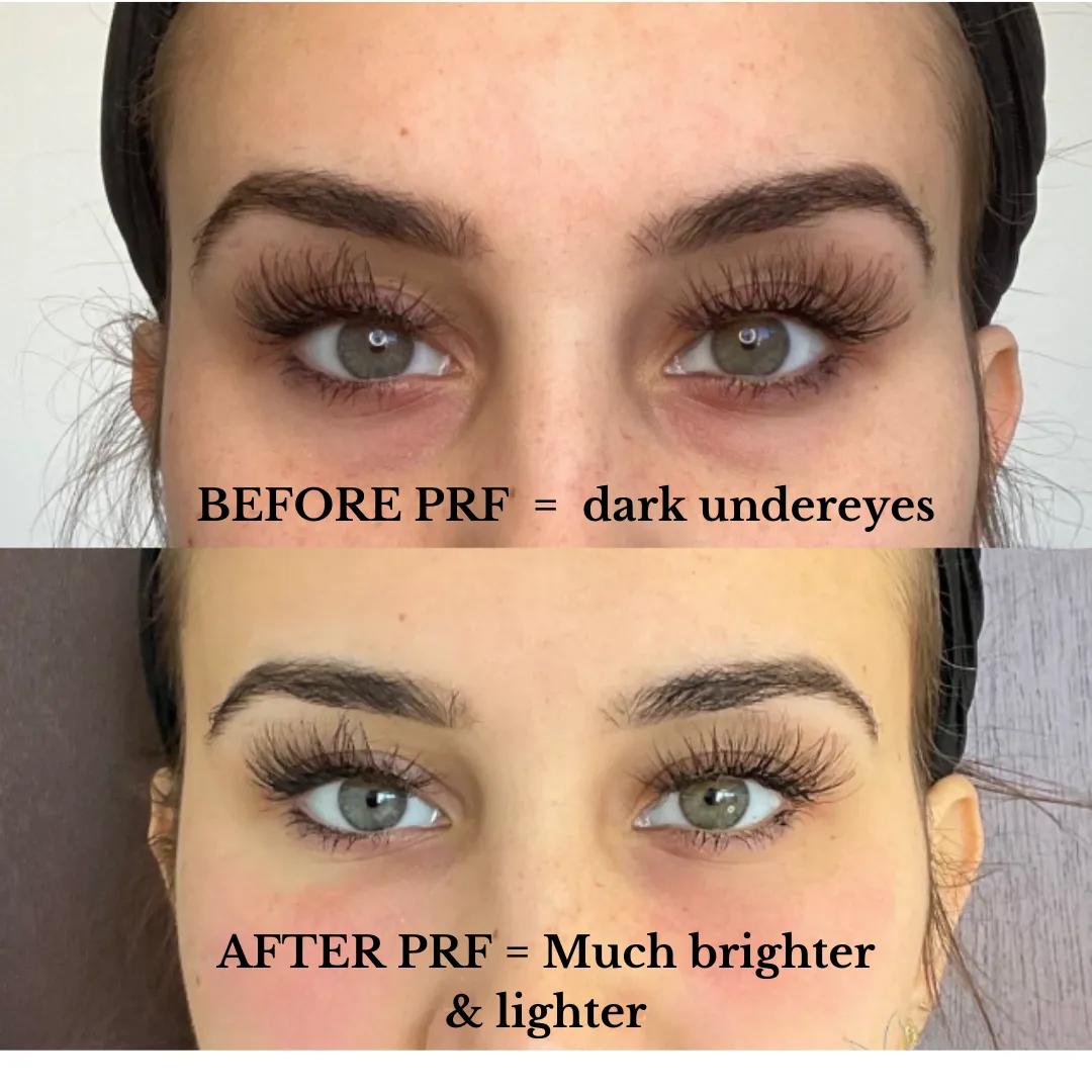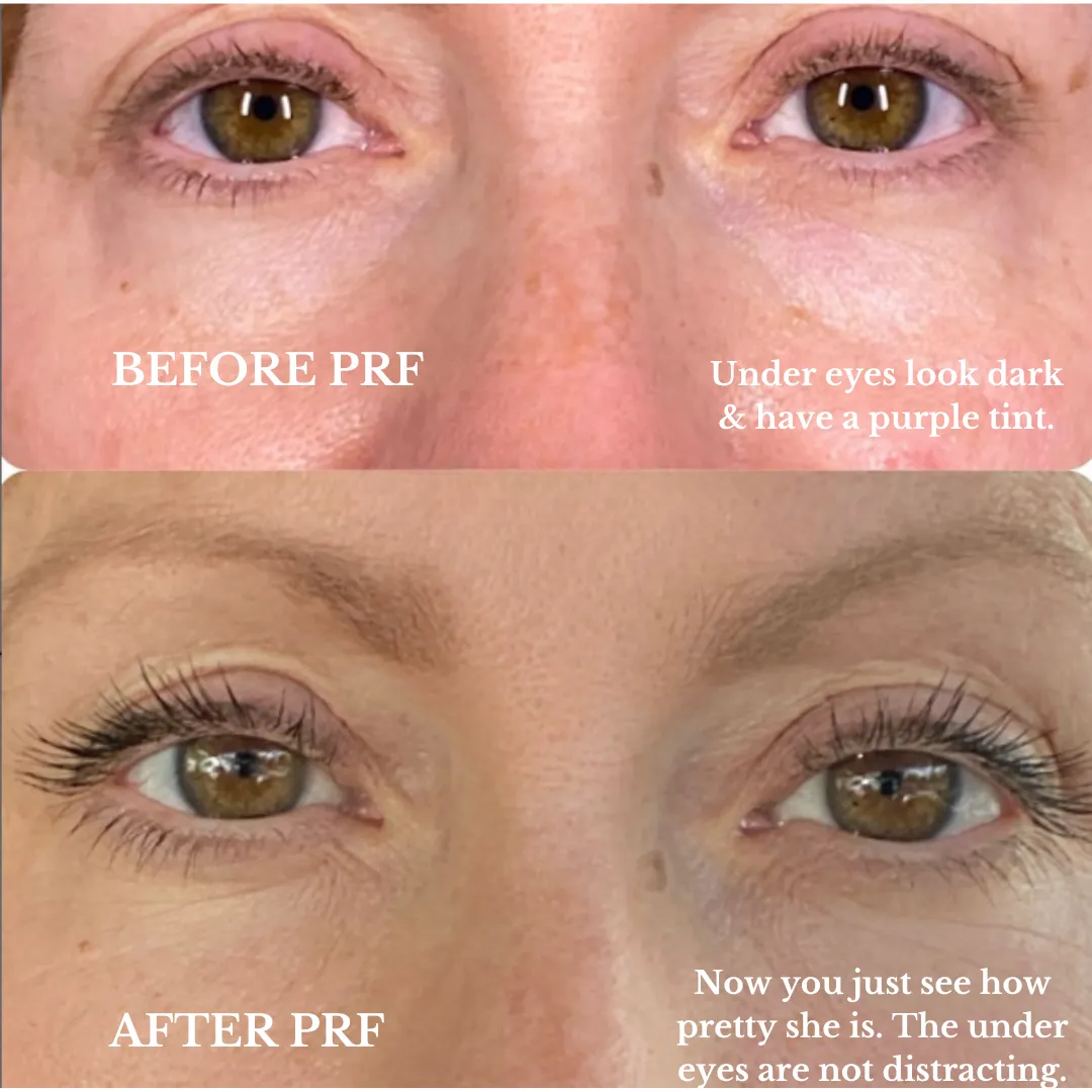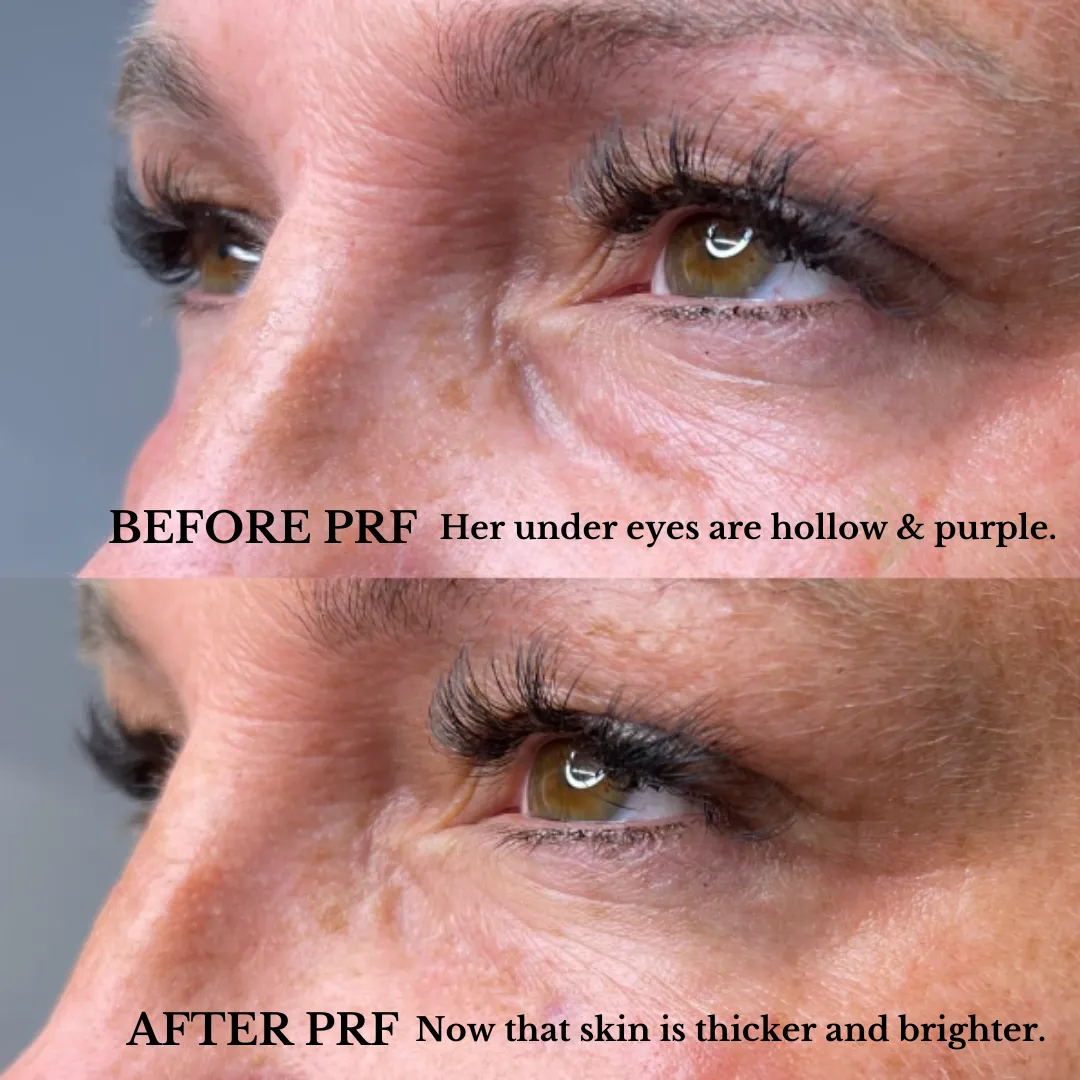 PRF under eyes takes less than an hour. We draw your blood, spin it down to retrieve the growth factors, number your face, and then gently place the PRF under your eyes. You will have some swelling for two days and possibly some bruising. There is no downtime.